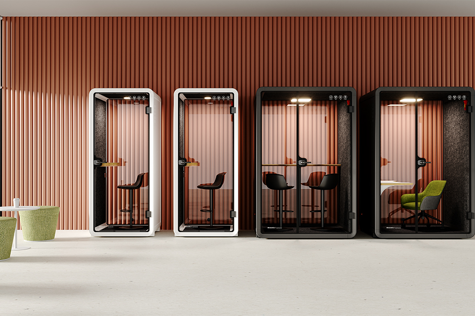 Seventeen models are currently available, ranging from compact call booths for one person to meeting pods for groups of up to eight people. The booths are equipped with ventilation, lighting and charging points and offer noise reduction of up to about 32 decibels. This enables professional video calling or confidential consultations without background noise. With their modern design and available colours, they can be coordinated with hotel interiors.